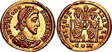 À cela s’ajoutent les conflits religieux qui témoignent déjà de la division apparaissant entre Orient et Occident. Déjà en 325, Constantin a dû convoquer un concile à Nicée pour résoudre (sans succès) la crise arienne[3]. Sous Constantin et ses successeurs, la progression du christianisme a brièvement été interrompue par le court règne de l’empereur Julien (r. 361-363) qui a permis le retour au pouvoir d’une partie de l’aristocratie païenne[4]. Pour succéder à Julien, l’armée a choisi Jovien, jeune officier chrétien d’une trentaine d’années, dont le règne sera aussi court que celui de son prédécesseur (r. 363-364) ; il sera marqué par le retour définitif du christianisme et une paix avec les Sassanides — déshonorante pour l’Empire. À la mort de Jovien, probablement accidentelle, et survenue le 17 février 364, c’est à nouveau l’armée qui lui choisit comme successeur un autre officier chrétien originaire de Pannonie, Flavius Valentinianus, lequel, pressé de nommer un coempereur, choisit son frère cadet Valens[5],[6].