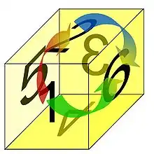 L'analyse par vecteurs et valeurs propres possède aussi comme domaine d'application la représentation des groupes. Une structure de groupe est parmi celles dont la définition algébrique est la plus simple, c'est un ensemble muni d'une seule opération notée souvent comme la multiplication. Si la définition est simple, en revanche, ces structures s'avèrent parfois suffisamment complexes pour que leur théorie ne soit pas encore complètement connue. Comme exemple de groupe, il est possible de citer celui des rotations du cube qui laissent son enveloppe invariante. La figure 9 montre que ce groupe est engendré par trois permutations, celle qui place la face 1 en position 2, représentée par la flèche rouge, celle représentée par la verte et enfin la bleue. Au total ce groupe comporte 24 éléments. Une représentation d'un groupe consiste à une identification de ses éléments avec des endomorphismes de telle manière que l'opération du groupe corresponde à la composition d'endomorphisme. Ainsi dans l'exemple de la figure, il existe une identification naturelle entre le groupe abstrait des 24 rotations du cube avec un groupe de rotations dans un espace de dimension 3.