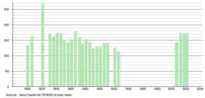 L'évolution du nombre d'habitants est connue à travers les recensements de la population effectués dans la commune depuis 1800. Pour les communes de moins de 10 000 habitants, une enquête de recensement portant sur toute la population est réalisée tous les cinq ans, les populations légales des années intermédiaires étant quant à elles estimées par interpolation ou extrapolation[10]. Pour la commune, le premier recensement exhaustif entrant dans le cadre du nouveau dispositif a été réalisé en 2007[11].