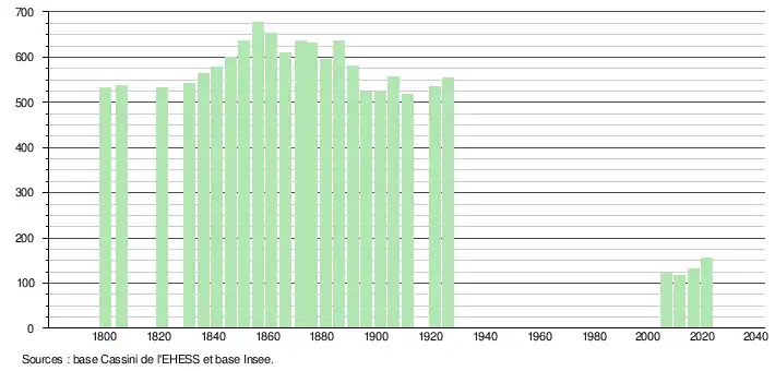 L'évolution du nombre d'habitants est connue à travers les recensements de la population effectués dans la commune depuis 1800. Pour les communes de moins de 10 000 habitants, une enquête de recensement portant sur toute la population est réalisée tous les cinq ans, les populations légales des années intermédiaires étant quant à elles estimées par interpolation ou extrapolation[19]. Pour la commune, le premier recensement exhaustif entrant dans le cadre du nouveau dispositif a été réalisé en 2006[20].