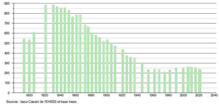 L'évolution du nombre d'habitants est connue à travers les recensements de la population effectués dans la commune depuis 1793. Pour les communes de moins de 10 000 habitants, une enquête de recensement portant sur toute la population est réalisée tous les cinq ans, les populations légales des années intermédiaires étant quant à elles estimées par interpolation ou extrapolation[18]. Pour la commune, le premier recensement exhaustif entrant dans le cadre du nouveau dispositif a été réalisé en 2005[19].