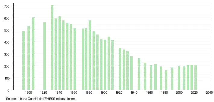 L'évolution du nombre d'habitants est connue à travers les recensements de la population effectués dans la commune depuis 1793. Pour les communes de moins de 10 000 habitants, une enquête de recensement portant sur toute la population est réalisée tous les cinq ans, les populations légales des années intermédiaires étant quant à elles estimées par interpolation ou extrapolation[21]. Pour la commune, le premier recensement exhaustif entrant dans le cadre du nouveau dispositif a été réalisé en 2006[22].