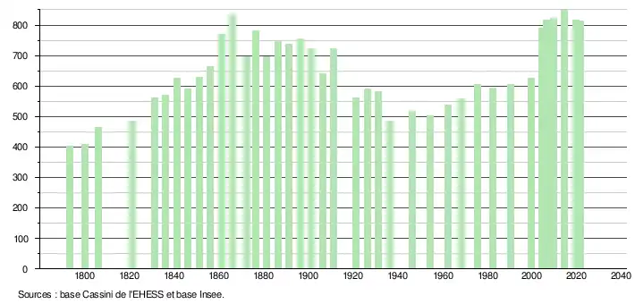 L'évolution du nombre d'habitants est connue à travers les recensements de la population effectués dans la commune depuis 1793. Pour les communes de moins de 10 000 habitants, une enquête de recensement portant sur toute la population est réalisée tous les cinq ans, les populations légales des années intermédiaires étant quant à elles estimées par interpolation ou extrapolation[17]. Pour la commune, le premier recensement exhaustif entrant dans le cadre du nouveau dispositif a été réalisé en 2004[18].