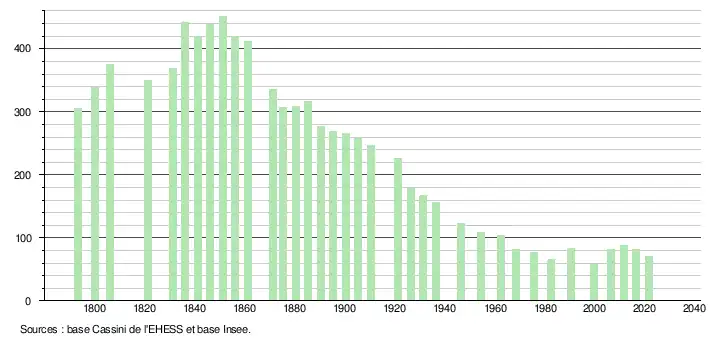 L'évolution du nombre d'habitants est connue à travers les recensements de la population effectués dans la commune depuis 1793. Pour les communes de moins de 10 000 habitants, une enquête de recensement portant sur toute la population est réalisée tous les cinq ans, les populations légales des années intermédiaires étant quant à elles estimées par interpolation ou extrapolation[19]. Pour la commune, le premier recensement exhaustif entrant dans le cadre du nouveau dispositif a été réalisé en 2006[20].