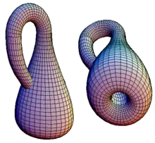 L'opération de topologie amusante la plus célèbre est certainement celle qui consiste à recoller deux bords d'un carré, mais en renversant l'orientation ; on n'obtient plus alors un cylindre mais un anneau de Möbius, aussi appelé bande de Möbius ou ruban de Möbius, qui est l'exemple standard pour illustrer la notion de variété non orientable. Il s'agit d'une variété à bord dont le bord est un cercle. En recollant un disque le long de ce cercle, on obtient un plan projectif réel. Si le ruban de Möbius peut être visualisé dans ℝ3, le recollement ne peut pas être effectué dans l'espace tridimensionnel : un quatrième degré de liberté est indispensable.