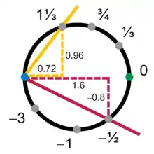 Voici un autre exemple de description du cercle. Prenons pour point de base le point de coordonnées (-1, 0) et traçons les différentes droites issues de ce point ; la droite de pente s recoupe le cercle en un point unique. La correspondance entre la pente de la droite et les coordonnées du point d'intersection est dans un sens :