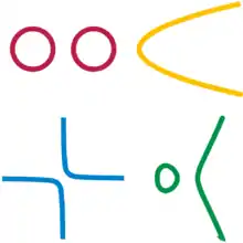 En revanche, les variétés se distinguent par leur aspect global. Par exemple sur la figure ci-contre, la variété rouge est formée de deux morceaux bornés (deux cercles), et il est visiblement impossible de déformer continûment celle-ci pour obtenir une des trois autres courbes.