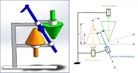 Deux cônes identiques (½-angle au sommet α et hauteur h) d'axes parallèles sont positionnés tête-bêche. Une roue (de diamètre quelconque) est insérée entre eux, tangente aux 2 cônes, entraînée par la rotation du cône moteur et entraînant la rotation du cône mené. La variation de position de l'arbre intermédiaire par glissement change l'ordonnée y du point de contact de la roue avec le cône moteur.