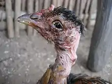 - Pour la forme sèche de la maladie : le symptôme le plus visible est l'apparition de pustules (pleines de pus),excroissance ou nodule croissant sur la peau des oiseaux malades, et dans quelques cas récents de grosses tumeurs (rem : le phénomène des tumeurs chez les oiseaux est encore en partie mal compris[11]). Ces tumeurs sont surtout présentes sur la tête (autour des yeux et du bec notamment) ou sur les pattes ou en bout d'ailes les rendent aussi plus vulnérables à la prédation.