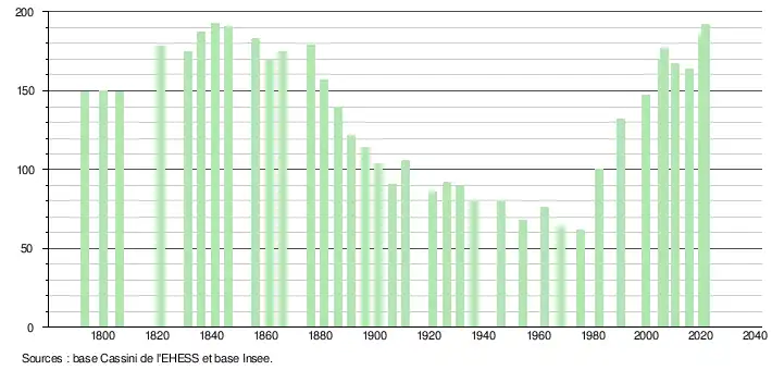 L'évolution du nombre d'habitants est connue à travers les recensements de la population effectués dans la commune depuis 1793. Pour les communes de moins de 10 000 habitants, une enquête de recensement portant sur toute la population est réalisée tous les cinq ans, les populations légales des années intermédiaires étant quant à elles estimées par interpolation ou extrapolation[19]. Pour la commune, le premier recensement exhaustif entrant dans le cadre du nouveau dispositif a été réalisé en 2005[20].