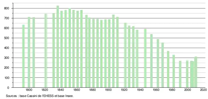 L'évolution du nombre d'habitants est connue à travers les recensements de la population effectués dans la commune depuis 1793. À partir du , les populations légales des communes sont publiées annuellement dans le cadre d'un recensement qui repose désormais sur une collecte d'information annuelle, concernant successivement tous les territoires communaux au cours d'une période de cinq ans. Pour les communes de moins de 10 000 habitants, une enquête de recensement portant sur toute la population est réalisée tous les cinq ans, les populations légales des années intermédiaires étant quant à elles estimées par interpolation ou extrapolation[33]. Pour la commune, le premier recensement exhaustif entrant dans le cadre du nouveau dispositif a été réalisé en 2006[34],[Note 1].