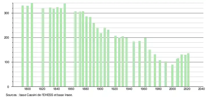 L'évolution du nombre d'habitants est connue à travers les recensements de la population effectués dans la commune depuis 1793. Pour les communes de moins de 10 000 habitants, une enquête de recensement portant sur toute la population est réalisée tous les cinq ans, les populations légales des années intermédiaires étant quant à elles estimées par interpolation ou extrapolation[19]. Pour la commune, le premier recensement exhaustif entrant dans le cadre du nouveau dispositif a été réalisé en 2007[20].