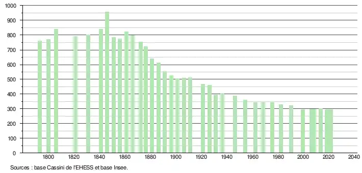 L'évolution du nombre d'habitants est connue à travers les recensements de la population effectués dans la commune depuis 1793. Pour les communes de moins de 10 000 habitants, une enquête de recensement portant sur toute la population est réalisée tous les cinq ans, les populations légales des années intermédiaires étant quant à elles estimées par interpolation ou extrapolation[26]. Pour la commune, le premier recensement exhaustif entrant dans le cadre du nouveau dispositif a été réalisé en 2008[27].