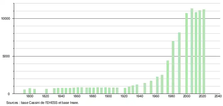 - Par convention dans Wikipédia, le principe a été retenu de n’afficher dans le tableau des recensements et le graphique, pour les populations légales postérieures à 1999, que les populations correspondant à une enquête exhaustive de recensement pour les communes de moins de 10 000 habitants, et que les populations des années 2006, 2011, 2016, etc. pour les communes de plus de 10 000 habitants, ainsi que la dernière population légale publiée par l’Insee pour l'ensemble des communes.