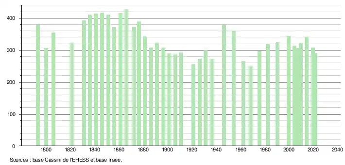 L'évolution du nombre d'habitants est connue à travers les recensements de la population effectués dans la commune depuis 1793. Pour les communes de moins de 10 000 habitants, une enquête de recensement portant sur toute la population est réalisée tous les cinq ans, les populations légales des années intermédiaires étant quant à elles estimées par interpolation ou extrapolation[30]. Pour la commune, le premier recensement exhaustif entrant dans le cadre du nouveau dispositif a été réalisé en 2004[31].