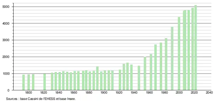 L'évolution du nombre d'habitants est connue à travers les recensements de la population effectués dans la commune depuis 1793. Pour les communes de moins de 10 000 habitants, une enquête de recensement portant sur toute la population est réalisée tous les cinq ans, les populations légales des années intermédiaires étant quant à elles estimées par interpolation ou extrapolation[27]. Pour la commune, le premier recensement exhaustif entrant dans le cadre du nouveau dispositif a été réalisé en 2007[28].