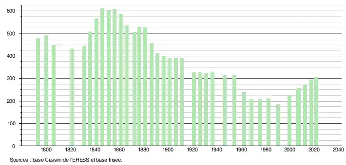 L'évolution du nombre d'habitants est connue à travers les recensements de la population effectués dans la commune depuis 1793. Pour les communes de moins de 10 000 habitants, une enquête de recensement portant sur toute la population est réalisée tous les cinq ans, les populations légales des années intermédiaires étant quant à elles estimées par interpolation ou extrapolation[27]. Pour la commune, le premier recensement exhaustif entrant dans le cadre du nouveau dispositif a été réalisé en 2007[28].