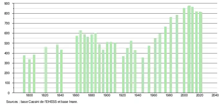 L'évolution du nombre d'habitants est connue à travers les recensements de la population effectués dans la commune depuis 1793. Pour les communes de moins de 10 000 habitants, une enquête de recensement portant sur toute la population est réalisée tous les cinq ans, les populations légales des années intermédiaires étant quant à elles estimées par interpolation ou extrapolation[21]. Pour la commune, le premier recensement exhaustif entrant dans le cadre du nouveau dispositif a été réalisé en 2005[22].