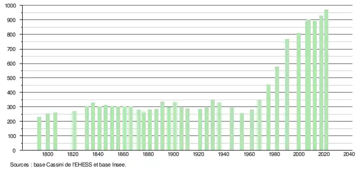 L'évolution du nombre d'habitants est connue à travers les recensements de la population effectués dans la commune depuis 1793. Pour les communes de moins de 10 000 habitants, une enquête de recensement portant sur toute la population est réalisée tous les cinq ans, les populations légales des années intermédiaires étant quant à elles estimées par interpolation ou extrapolation[31]. Pour la commune, le premier recensement exhaustif entrant dans le cadre du nouveau dispositif a été réalisé en 2007[32].