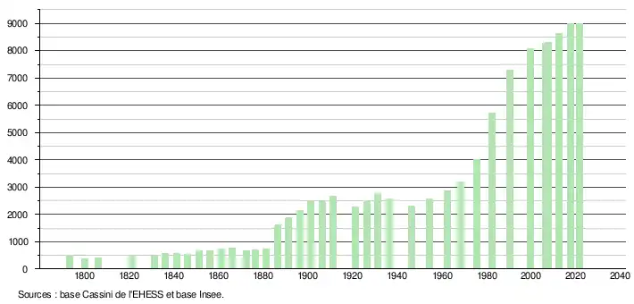 L'évolution du nombre d'habitants est connue à travers les recensements de la population effectués dans la commune depuis 1793. Pour les communes de moins de 10 000 habitants, une enquête de recensement portant sur toute la population est réalisée tous les cinq ans, les populations légales des années intermédiaires étant quant à elles estimées par interpolation ou extrapolation[17]. Pour la commune, le premier recensement exhaustif entrant dans le cadre du nouveau dispositif a été réalisé en 2007[18].