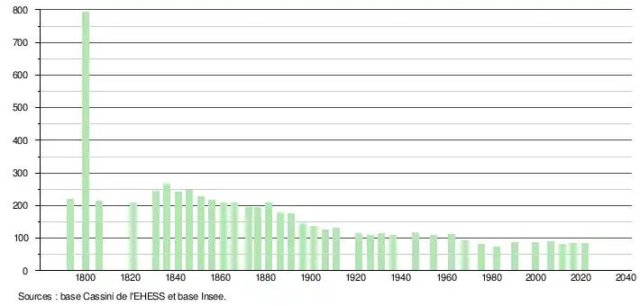 L'évolution du nombre d'habitants est connue à travers les recensements de la population effectués dans la commune depuis 1793. Pour les communes de moins de 10 000 habitants, une enquête de recensement portant sur toute la population est réalisée tous les cinq ans, les populations légales des années intermédiaires étant quant à elles estimées par interpolation ou extrapolation[18]. Pour la commune, le premier recensement exhaustif entrant dans le cadre du nouveau dispositif a été réalisé en 2006[19].