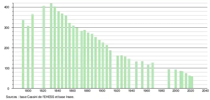 L'évolution du nombre d'habitants est connue à travers les recensements de la population effectués dans la commune depuis 1793. Pour les communes de moins de 10 000 habitants, une enquête de recensement portant sur toute la population est réalisée tous les cinq ans, les populations légales des années intermédiaires étant quant à elles estimées par interpolation ou extrapolation[14]. Pour la commune, le premier recensement exhaustif entrant dans le cadre du nouveau dispositif a été réalisé en 2008[15].