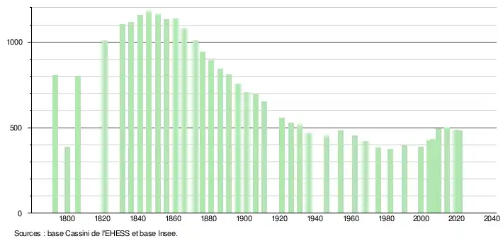 L'évolution du nombre d'habitants est connue à travers les recensements de la population effectués dans la commune depuis 1793. Pour les communes de moins de 10 000 habitants, une enquête de recensement portant sur toute la population est réalisée tous les cinq ans, les populations légales des années intermédiaires étant quant à elles estimées par interpolation ou extrapolation[18]. Pour la commune, le premier recensement exhaustif entrant dans le cadre du nouveau dispositif a été réalisé en 2004[19].