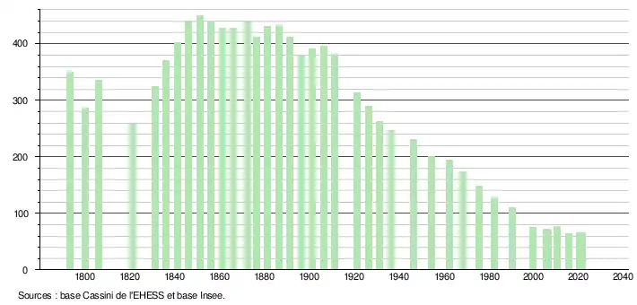 L'évolution du nombre d'habitants est connue à travers les recensements de la population effectués dans la commune depuis 1793. Pour les communes de moins de 10 000 habitants, une enquête de recensement portant sur toute la population est réalisée tous les cinq ans, les populations légales des années intermédiaires étant quant à elles estimées par interpolation ou extrapolation[25]. Pour la commune, le premier recensement exhaustif entrant dans le cadre du nouveau dispositif a été réalisé en 2005[26].