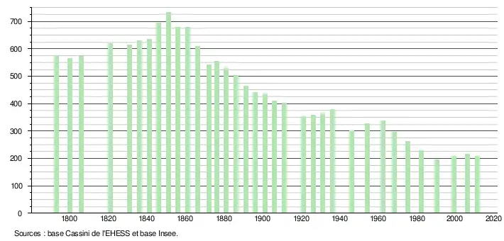 L'évolution du nombre d'habitants est connue à travers les recensements de la population effectués dans la commune depuis 1793. À partir du , les populations légales des communes sont publiées annuellement dans le cadre d'un recensement qui repose désormais sur une collecte d'information annuelle, concernant successivement tous les territoires communaux au cours d'une période de cinq ans. Pour les communes de moins de 10 000 habitants, une enquête de recensement portant sur toute la population est réalisée tous les cinq ans, les populations légales des années intermédiaires étant quant à elles estimées par interpolation ou extrapolation[12]. Pour la commune, le premier recensement exhaustif entrant dans le cadre du nouveau dispositif a été réalisé en 2006[13],[Note 2].