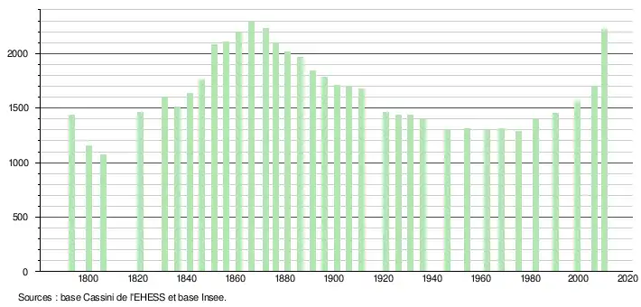 L'évolution du nombre d'habitants est connue à travers les recensements de la population effectués dans la commune depuis 1793. À partir du , les populations légales des communes sont publiées annuellement dans le cadre d'un recensement qui repose désormais sur une collecte d'information annuelle, concernant successivement tous les territoires communaux au cours d'une période de cinq ans. Pour les communes de moins de 10 000 habitants, une enquête de recensement portant sur toute la population est réalisée tous les cinq ans, les populations légales des années intermédiaires étant quant à elles estimées par interpolation ou extrapolation[10]. Pour la commune, le premier recensement exhaustif entrant dans le cadre du nouveau dispositif a été réalisé en 2005[11],[Note 1].
