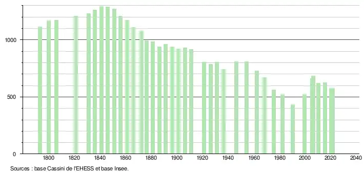 L'évolution du nombre d'habitants est connue à travers les recensements de la population effectués dans la commune depuis 1793. Pour les communes de moins de 10 000 habitants, une enquête de recensement portant sur toute la population est réalisée tous les cinq ans, les populations légales des années intermédiaires étant quant à elles estimées par interpolation ou extrapolation[20]. Pour la commune, le premier recensement exhaustif entrant dans le cadre du nouveau dispositif a été réalisé en 2005[21].