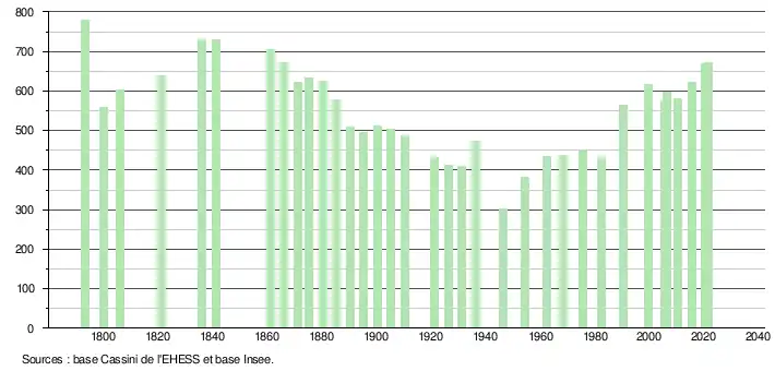 L'évolution du nombre d'habitants est connue à travers les recensements de la population effectués dans la commune depuis 1793. Pour les communes de moins de 10 000 habitants, une enquête de recensement portant sur toute la population est réalisée tous les cinq ans, les populations légales des années intermédiaires étant quant à elles estimées par interpolation ou extrapolation[16]. Pour la commune, le premier recensement exhaustif entrant dans le cadre du nouveau dispositif a été réalisé en 2005[17].