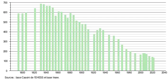 L'évolution du nombre d'habitants est connue à travers les recensements de la population effectués dans la commune depuis 1793. Pour les communes de moins de 10 000 habitants, une enquête de recensement portant sur toute la population est réalisée tous les cinq ans, les populations légales des années intermédiaires étant quant à elles estimées par interpolation ou extrapolation[16]. Pour la commune, le premier recensement exhaustif entrant dans le cadre du nouveau dispositif a été réalisé en 2004[17].