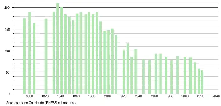L'évolution du nombre d'habitants est connue à travers les recensements de la population effectués dans la commune depuis 1793. Pour les communes de moins de 10 000 habitants, une enquête de recensement portant sur toute la population est réalisée tous les cinq ans, les populations légales des années intermédiaires étant quant à elles estimées par interpolation ou extrapolation[14]. Pour la commune, le premier recensement exhaustif entrant dans le cadre du nouveau dispositif a été réalisé en 2007[15].