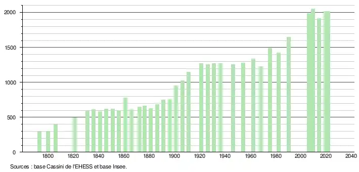 L'évolution du nombre d'habitants est connue à travers les recensements de la population effectués dans la commune depuis 1793. Pour les communes de moins de 10 000 habitants, une enquête de recensement portant sur toute la population est réalisée tous les cinq ans, les populations légales des années intermédiaires étant quant à elles estimées par interpolation ou extrapolation[28]. Pour la commune, le premier recensement exhaustif entrant dans le cadre du nouveau dispositif a été réalisé en 2009[29].