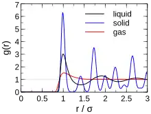 On retrouve dans les verres l'ordre à courte distance (à l'échelle maximale de quelques distances interatomiques), mais pas au-delà. Ce qui s'illustre par un premier pic fin de fonctions de distribution radiale comme pour un cristal, puis des pics de plus en plus élargis, contrairement à un cristal idéal.