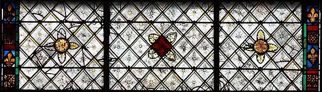 La bordure du vitrail de droite, de son côté, présente sur une bande rouge une alternance des armes de Navarre, et une fleur de lys d'or sur fond d'azur, certainement mise comme armes de France simplifiées. Dans la liste des monarques de Navarre, cette superposition de France et de Navarre n'a été portée que par la branche capétienne ; et la date de réalisation du vitrail (second quart du XIVe siècledésigne ici comme titulaire Jeanne II de Navarre (1311-1349). Cette signature la désigne comme donatrice, ou éventuellement sa fille Blanche de Navarre agissant en son nom[2].