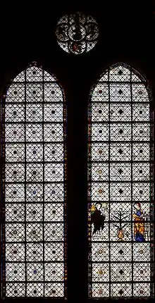 Les deux lancettes sont traversées de neuf barlotières horizontales et deux verticales, délimitant trente six panneaux dont trente et un rectangulaires.