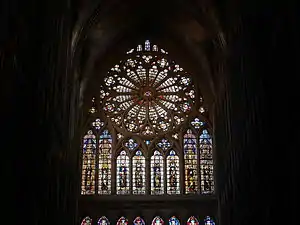 La verrière a des proportions monumentales. Haute de vingt-huit mètres, elle est large de treize mètres. Sa rosace est du type de la « Rota », une rose à composition radiale de onze mètres de diamètre. Son œil quadrilobé est entouré de seize quartiers trilobés au premier rang, de huit quadrilobes et huit trilobes alternés au second rang. Un écoinçon à cinq ajours complète le tympan. Sous la rose, quatre quadrilobes et sept écoinçons assurent la jonction avec le registre supérieur formé de huit lancettes trilobées. Le registre inférieur présente huit lancettes lancéolées. Les barlotières utilisées sont orthogonales, type d’assemblage commun depuis le XIIe siècle.