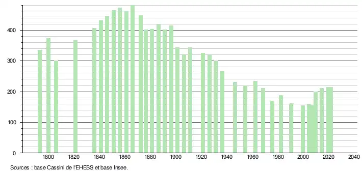 L'évolution du nombre d'habitants est connue à travers les recensements de la population effectués dans la commune depuis 1793. Pour les communes de moins de 10 000 habitants, une enquête de recensement portant sur toute la population est réalisée tous les cinq ans, les populations légales des années intermédiaires étant quant à elles estimées par interpolation ou extrapolation[13]. Pour la commune, le premier recensement exhaustif entrant dans le cadre du nouveau dispositif a été réalisé en 2004[14].