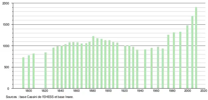 L'évolution du nombre d'habitants est connue à travers les recensements de la population effectués dans la commune depuis 1793. À partir du , les populations légales des communes sont publiées annuellement dans le cadre d'un recensement qui repose désormais sur une collecte d'information annuelle, concernant successivement tous les territoires communaux au cours d'une période de cinq ans. Pour les communes de moins de 10 000 habitants, une enquête de recensement portant sur toute la population est réalisée tous les cinq ans, les populations légales des années intermédiaires étant quant à elles estimées par interpolation ou extrapolation[5]. Pour la commune, le premier recensement exhaustif entrant dans le cadre du nouveau dispositif a été réalisé en 2005[6],[Note 1].