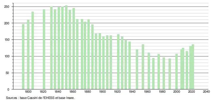 L'évolution du nombre d'habitants est connue à travers les recensements de la population effectués dans la commune depuis 1793. Pour les communes de moins de 10 000 habitants, une enquête de recensement portant sur toute la population est réalisée tous les cinq ans, les populations légales des années intermédiaires étant quant à elles estimées par interpolation ou extrapolation[16]. Pour la commune, le premier recensement exhaustif entrant dans le cadre du nouveau dispositif a été réalisé en 2008[17].