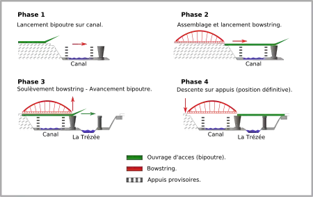 Les bipoutres des ouvrages d’accès franchissant la Trézée ont été assemblés sur la plate-forme de travail située au nord. Ils ont été lancés au-dessus du canal de Briare et installés sur des appuis provisoires à l’emplacement définitif du bow-string. Ils ont ainsi pu servir de chemin de roulement pour l’appui avant du bow-string.