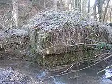 La proximité du ruisseau implique une qualité de sol médiocre. Il est composé principalement d'alluvions déposées par le " Furand". Pour assurer la stabilité de l'ouvrage, sous le massif en béton ont été réalisés des cadres en bastaings de bois enfoncés à une certaine profondeur. Ces cadres sont remplis de galets renforçant le socle des fondations. La pile en fer est fixée sur le socle en béton par des boulons de diamètre 35 mm espacés de 40 cm. Le socle en béton permet de transmettre les efforts de la pile vers le sol.