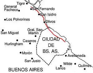 L'Avenida del Libertador, qui passe d'abord, au nord de Buenos Aires, par Olivos (une quinzaine de kilomètres), avant de rejoindre San Isidro et San Fernando. À l'est, le Río de la Plata.