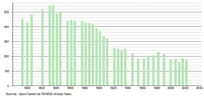 L'évolution du nombre d'habitants est connue à travers les recensements de la population effectués dans la commune depuis 1793. Pour les communes de moins de 10 000 habitants, une enquête de recensement portant sur toute la population est réalisée tous les cinq ans, les populations légales des années intermédiaires étant quant à elles estimées par interpolation ou extrapolation[22]. Pour la commune, le premier recensement exhaustif entrant dans le cadre du nouveau dispositif a été réalisé en 2006[23].