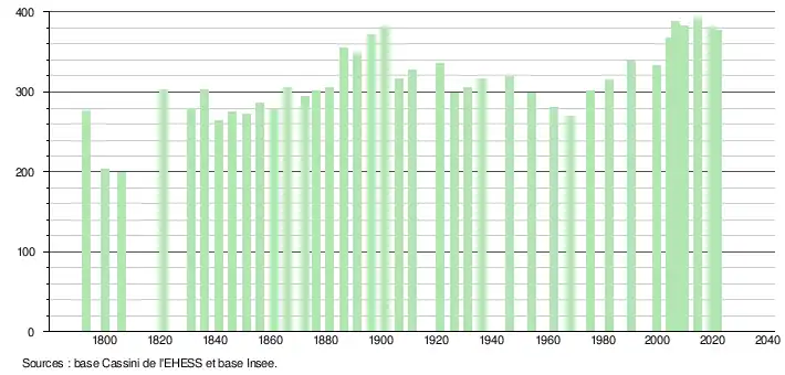 L'évolution du nombre d'habitants est connue à travers les recensements de la population effectués dans la commune depuis 1793. Pour les communes de moins de 10 000 habitants, une enquête de recensement portant sur toute la population est réalisée tous les cinq ans, les populations légales des années intermédiaires étant quant à elles estimées par interpolation ou extrapolation[37]. Pour la commune, le premier recensement exhaustif entrant dans le cadre du nouveau dispositif a été réalisé en 2004[38].