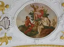 Au centre de la voûte sont des fresques partiellement recouvertes attribuées, par des considérations stylistiques à Caspar Gottfried Stuber, qui les a probablement peintes en 1712 avec son fils Nikolaus Gottfried Stuber. Les fresques du plafond représentent, d'est en ouest: Marie Immaculée, Dieu le Père lors de la création du ciel et de la terre, l'ouverture centrale entourée d'une auréole avec anges, la chute biblique et la rédemption. Au-dessus de l'orgue, une fresque du Christ au jour du jugement dernier.