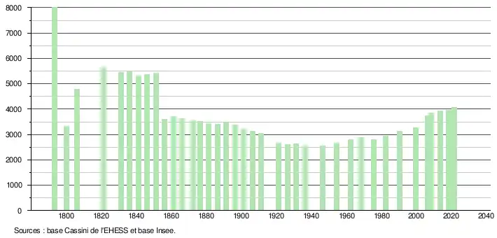 L'évolution du nombre d'habitants est connue à travers les recensements de la population effectués dans la commune depuis 1793. Pour les communes de moins de 10 000 habitants, une enquête de recensement portant sur toute la population est réalisée tous les cinq ans, les populations légales des années intermédiaires étant quant à elles estimées par interpolation ou extrapolation[21]. Pour la commune, le premier recensement exhaustif entrant dans le cadre du nouveau dispositif a été réalisé en 2008[22].