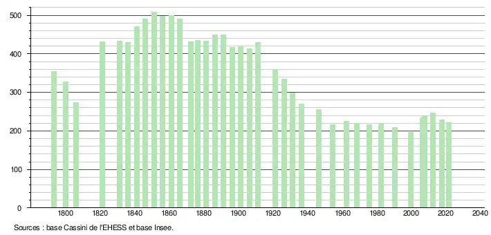 L'évolution du nombre d'habitants est connue à travers les recensements de la population effectués dans la commune depuis 1793. Pour les communes de moins de 10 000 habitants, une enquête de recensement portant sur toute la population est réalisée tous les cinq ans, les populations légales des années intermédiaires étant quant à elles estimées par interpolation ou extrapolation[23]. Pour la commune, le premier recensement exhaustif entrant dans le cadre du nouveau dispositif a été réalisé en 2007[24].